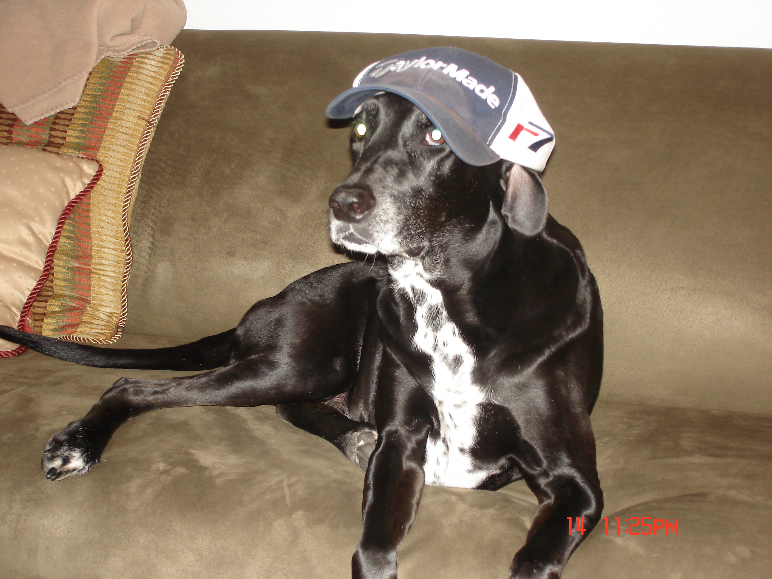 Chloe would be great for the job. She has great endurance and can carry that bag forever. She loves to lick stuff and will use that skill to keep those clubs super clean. She has a blast chasing furry stuff and flying divots look like birds, so no problem there. And, when those annoying cameras go off in his backswing, she can chase down the offender and bit em in the butt. It would be a perfect team. Just saying!