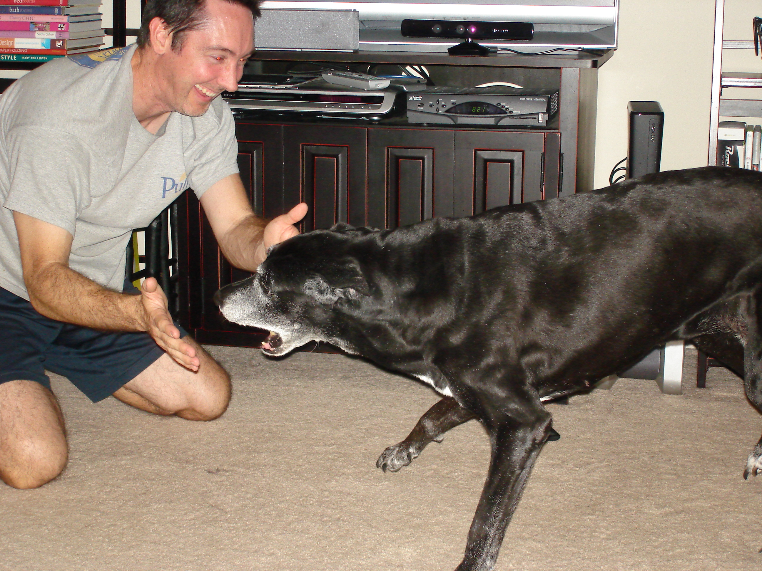 Friday September 14th. Chloe is such a begging dog. She is always in the kitchen or in your face when there is food around. I guess I didn’t do the best job when it came to training in that area! She has been tearing through her food today and I started adding some boiled chicken or turkey to it. She loves that stuff and goes crazy for it. We took her on several walks today around the complex and she loves to be outside. A little slow, but she has no problem sniffing out every other dog around and taking her time. She is so cute. After dinner  we played our favorite game together. She loves it when I get down on all fours and try to get her front paws. Check out the picture!