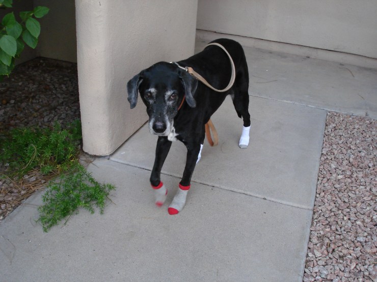 Since we moved out to the desert, we have had to be aware of how hot the sidewalks are. It got hot in Florida, but these sidewalks in the sun all day get pretty hot and bother Chloe’s paws. They don’t bother Chanel though. Maybe it is Chloe’s age. After looking at all kinds of booties and sport socks or shoes for dogs, we came up with a cheap alternative that works perfect. Kids athletic socks from target work perfect. And Chloe is half Greyhound, so it looks like she can break out in a sprint any second!